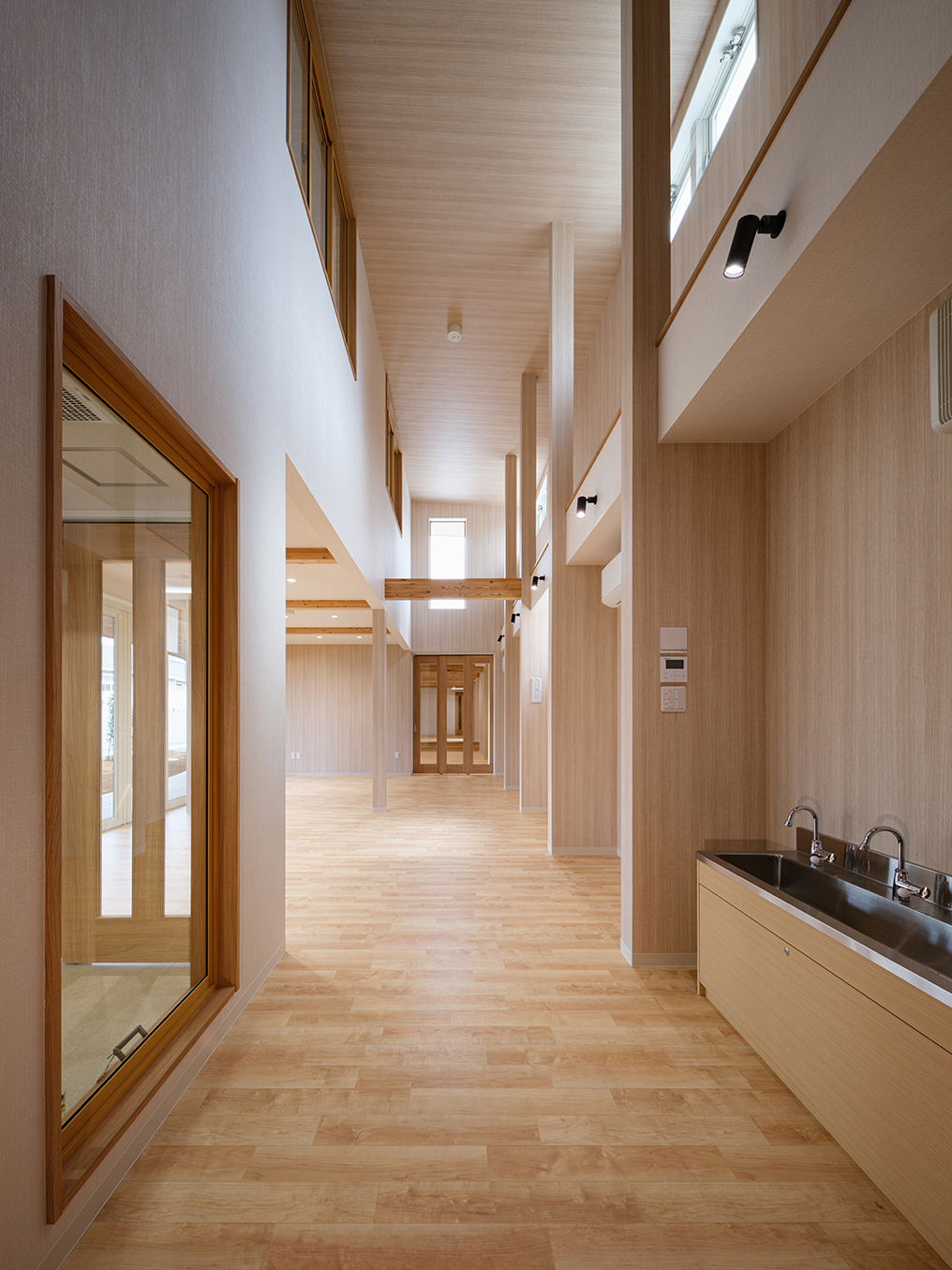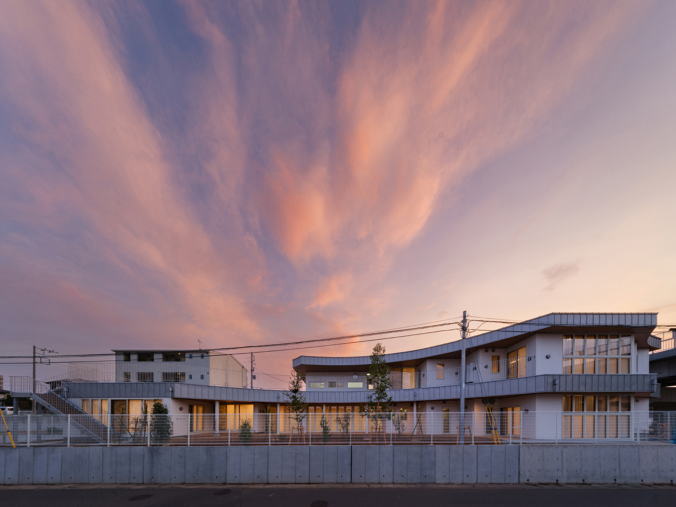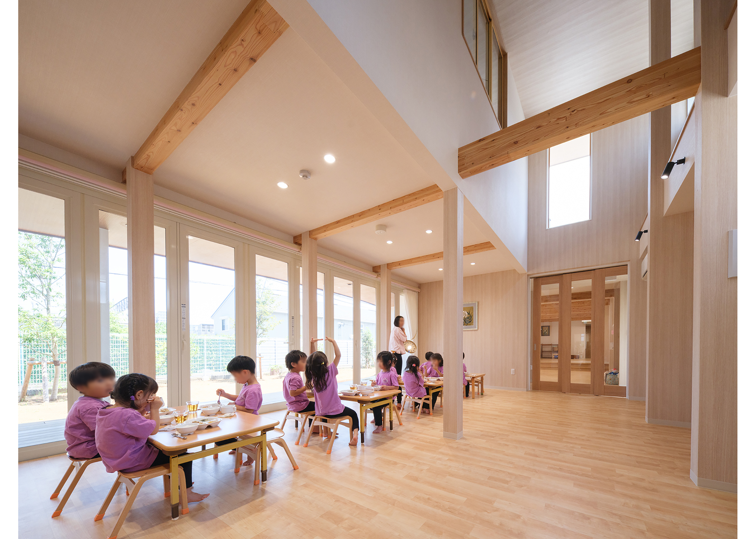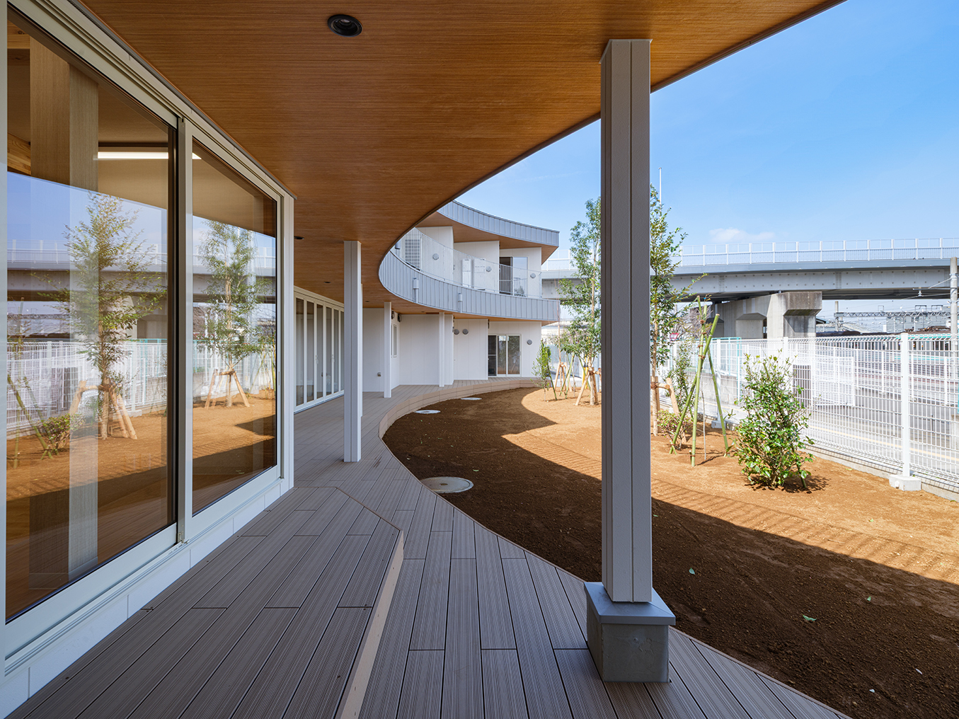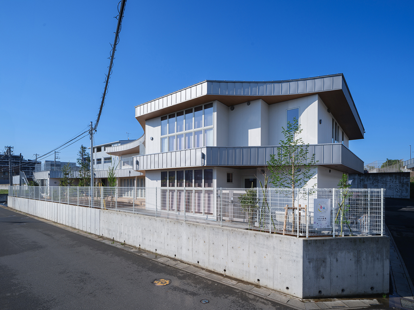 土地区画整備事業により2段の雛壇状に造成された細長い敷地。 その形状に沿って、高台側隣地とのセキュリティや日に日に強まる日差しのに配慮した半平屋の建物。一間を基本単位とした袖壁状にして、各部屋を結ぶ吹抜け廊下に発生させた。連続する袖壁空間は、日中の光の変化とともに子どもの気配を上下 階に柔らかく伝えながら、収納空間・展示スペース等の様々な用途に変化する。 各室は、1辺を基本単位である一間×αに設定。もう一方を想定活動、使用年齢、その他要素に応じて伸び縮みさせ、教育展開を支えることを目指した。凹凸しながら配置された空間を曲線的に結び、保育空間をつなぐ庇下の空間を設定した。保育プログラムに園庭‧庇下空間‧吹抜廊下‧屋上を介して繋がり、子どもの居場所に豊かな経験の可能性を創り出した。